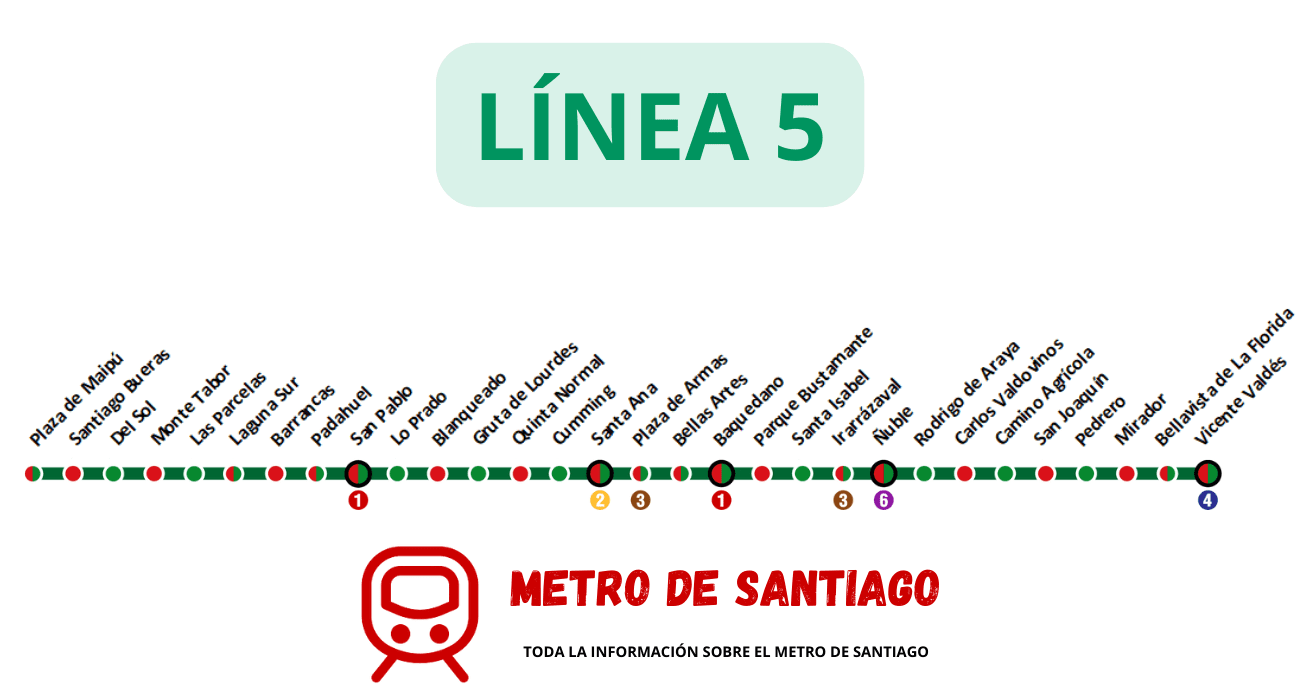 La L5, cuyo color identificativo es el verde, viaja desde Plaza de Maipú hasta Vicente Valdés.